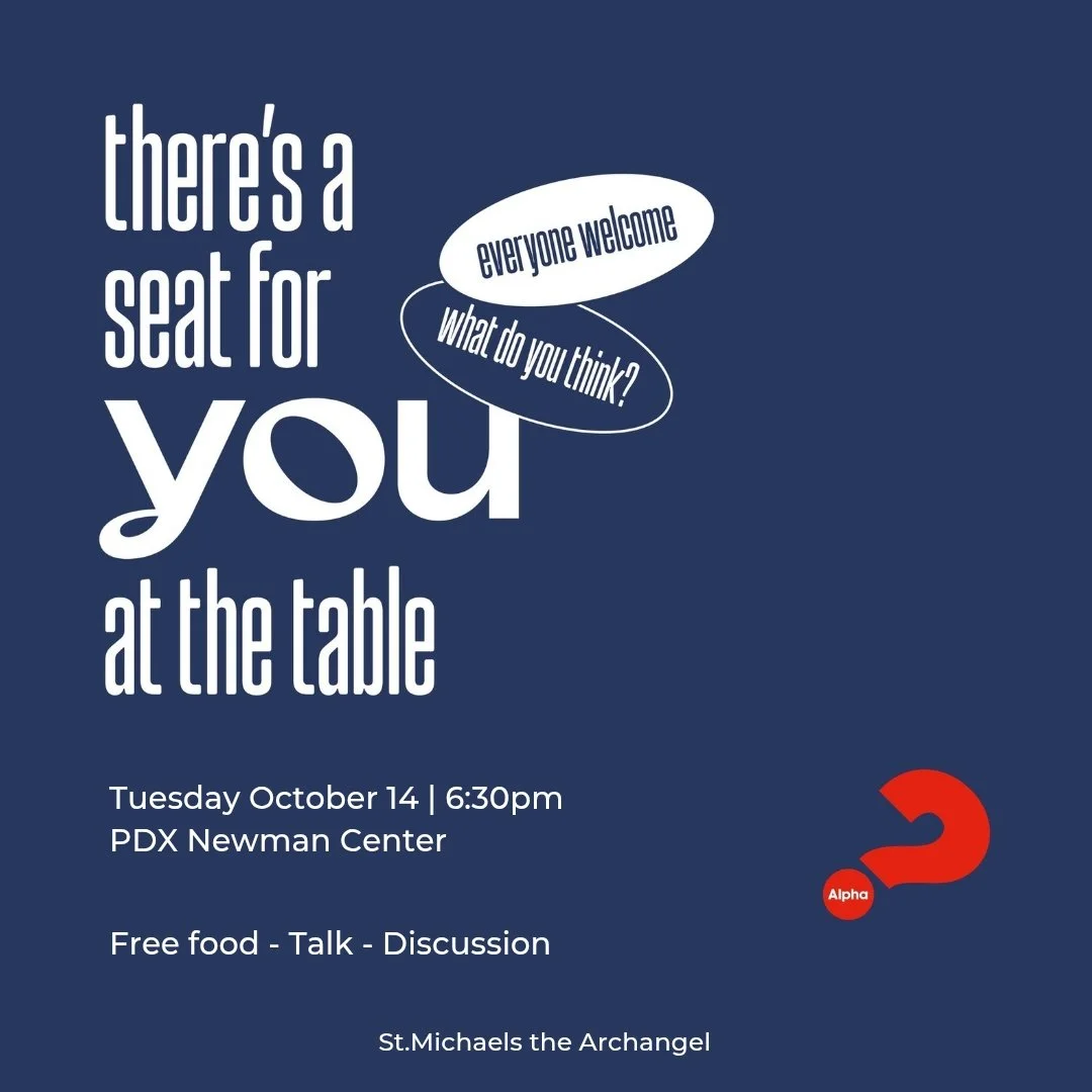 Alpha begins Wednesday, October 14th at 6:30 p.m. and runs through November 18th. We will meet at the PDX Newman Center.