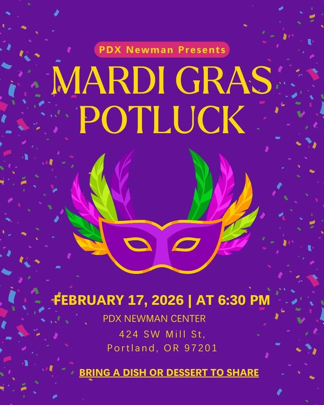 Join us for our Mardi Gras Celebration at the PDX Newman Center! We will gather for a festive potluck-style dinner and fellowship before the Lenten season begins.